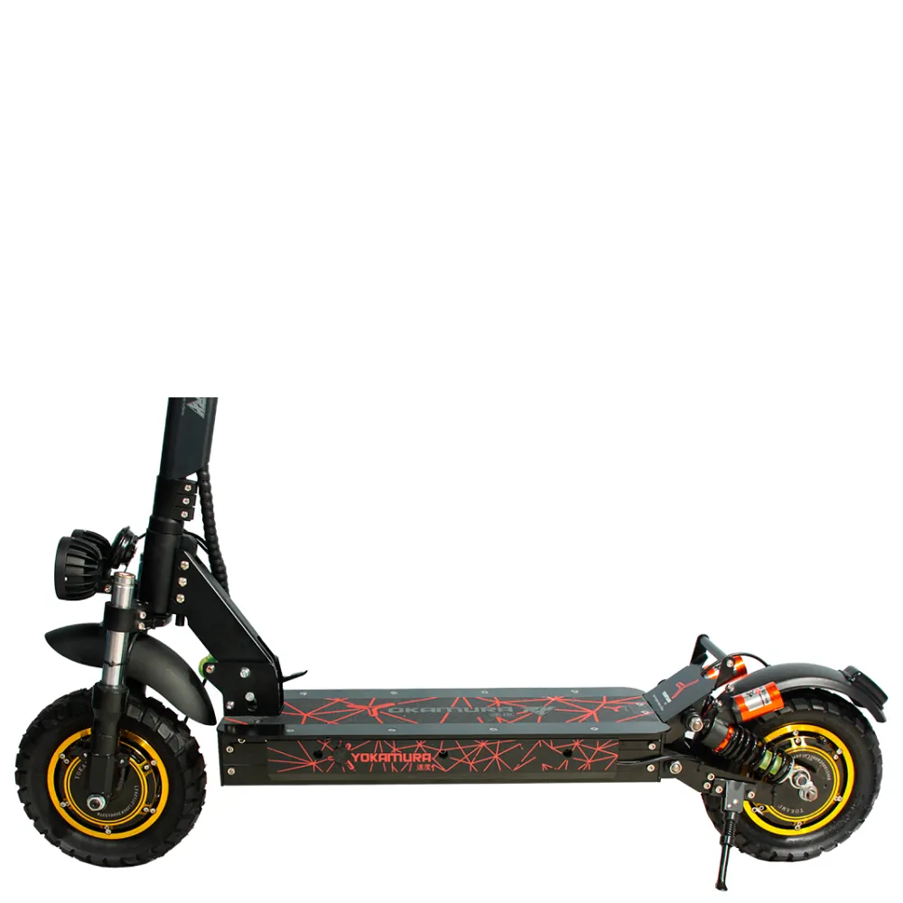 Самокат YOKAMURA RX1 на одном заряде аккумулятора преодолевает расстояние 60 км. Дисковая тормозная система на переднем и заднем колесе позволяет совершать маневры, амортизация делает движение электросамоката плавным даже на не ровной дороге. Производитель предусмотрел внешнее освещение для передвижения в темное время суток.