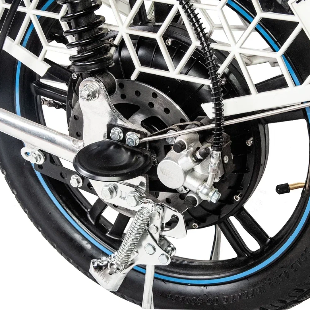 Велосипед прост в управлении и ремонте. Для удобства вождения имеется мягкое сиденье и платформа для ног. Так как изначально это модель была продумана для сферы услуг доставки, то можно установить дополнительную корзину-багажник сзади. Подойдут для перевозки каких-либо вещей или сумок. Безопасность и комфорт на дорогах обеспечат 2 зеркала заднего вида, а также надежные барабанные тормоза. Мощное мотор-колесо позволяет разогнаться до 50 км/ч. Емкий аккумулятор 60В/12Ач рассчитан на пробег до 45 км на одном заряде.