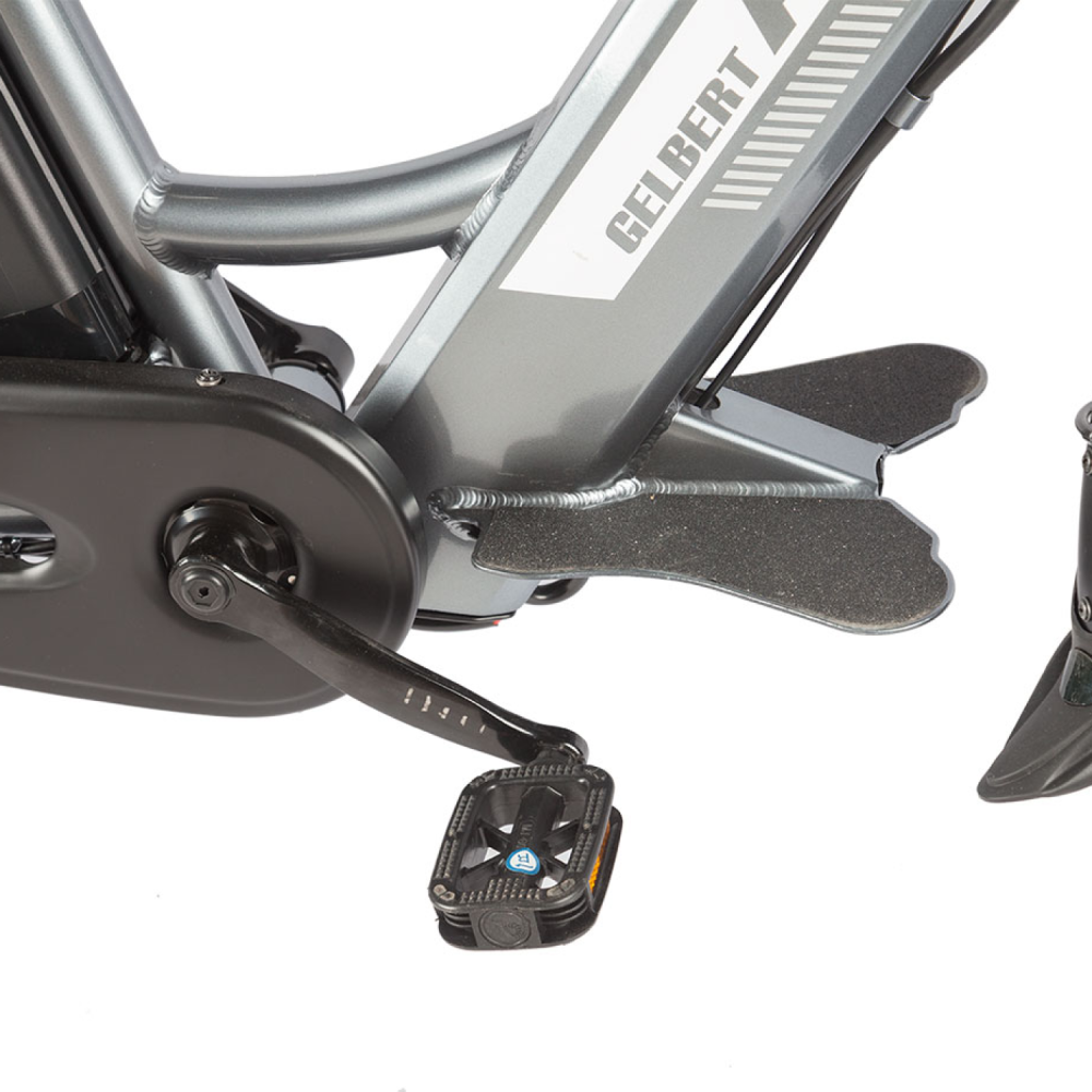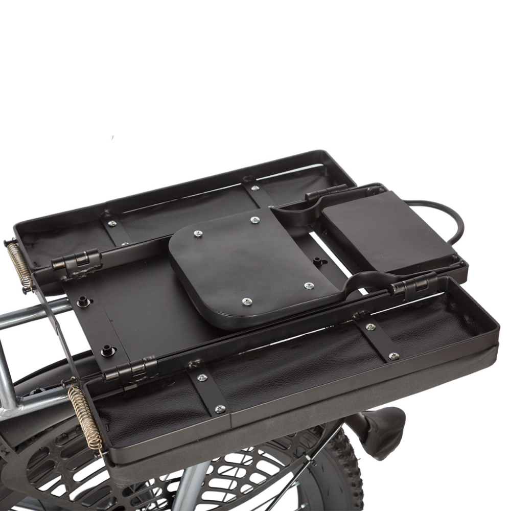 Платформа для ног, как у скутера, позволяет пассажиру ехать удобно, не зависая в воздухе. А ручка газа превращает езду в расслабленное удовольствие без педалирования.