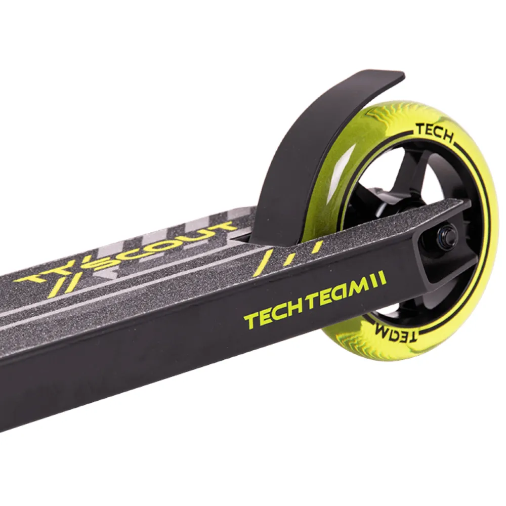 На этапе изготовления компания tech учла ошибки предыдущей линейки. Самокаты tech для начинающих райдеров изготовлены из высокопрочного надежного материала. Парковый самокат имеет алюминиевую деку габаритами 49х12 см с футспейсом 34 см. Оснащенность team scout конкейвом позволяет осваивать трюковые элементы, контролировать действия ездока. Трюковый самокат tech team  имеет Т-образную форму руля. Ширина руля составляет 54см. Высоты руля от зажима (61,5 см) достаточно для ездоков начального уровня. Базовая модель techteam scout оснащена накатистыми полиуретановыми колесами с металлическим сердечником, промышленными подшипниками Abec 9. Каждый из трюковых элементов гарантирует максимальный разгон, важный для каждого трюкача.