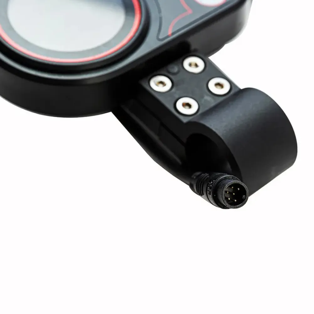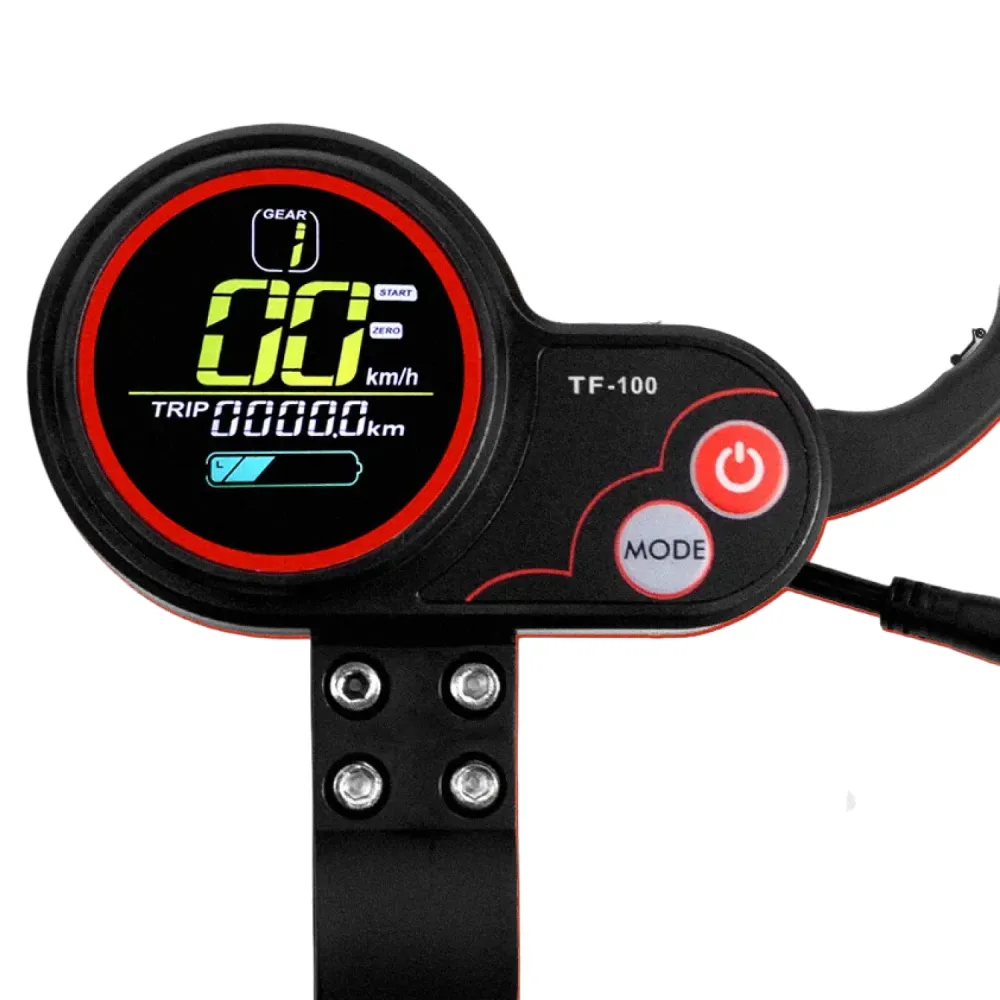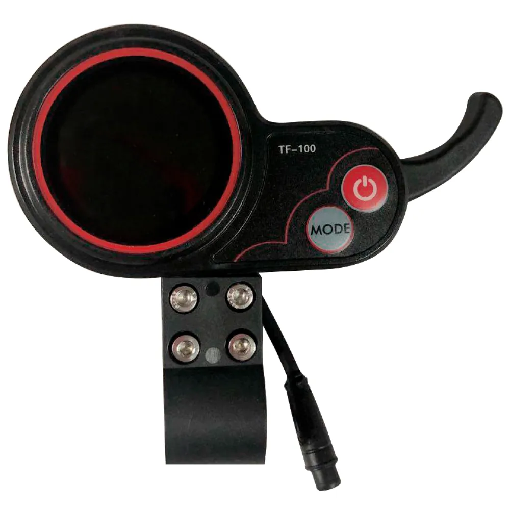 Бортовой компьютер представлен в пластиковом корпусе ,на нём располагает курок для набора скорости. Он имеет аккуратный небольшой дисплей круглой формы. Сам дисплей цветной, для управления предусмотрены 2 кнопки, а именно кнопка включения и Mode. Они требуются для навигации в меню, выбора нужных параметров, сохранения настроек и смены скорости.